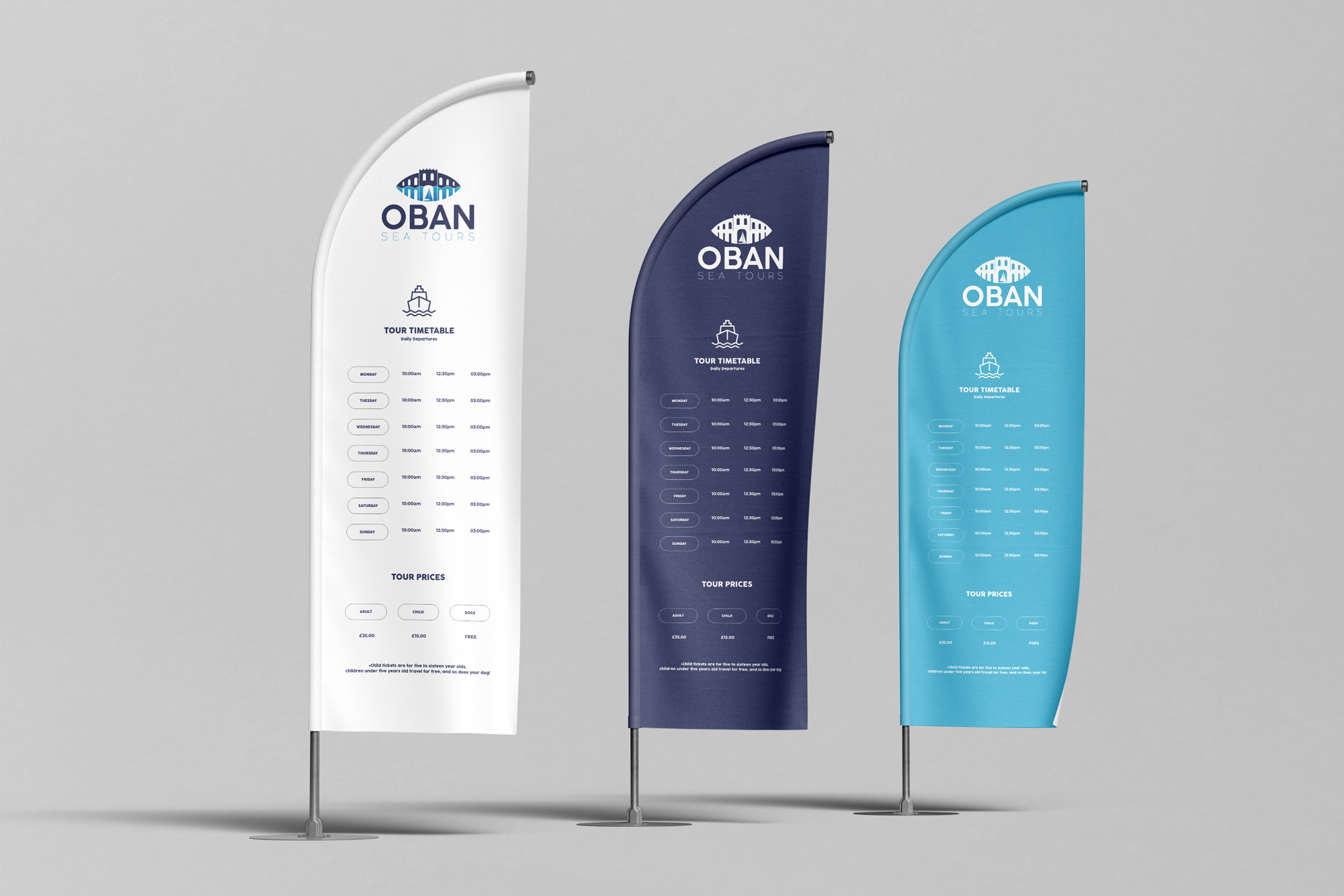 We developed a new brand identity for Oban Sea Tours, starting with in-depth research and competitor analysis. Our goal was to create a distinctive logo and color scheme that stood out in a crowded market while reflecting the natural beauty and character of the region. The resulting designs are showcased across merchandise and signage, enhancing visibility and promoting the business.