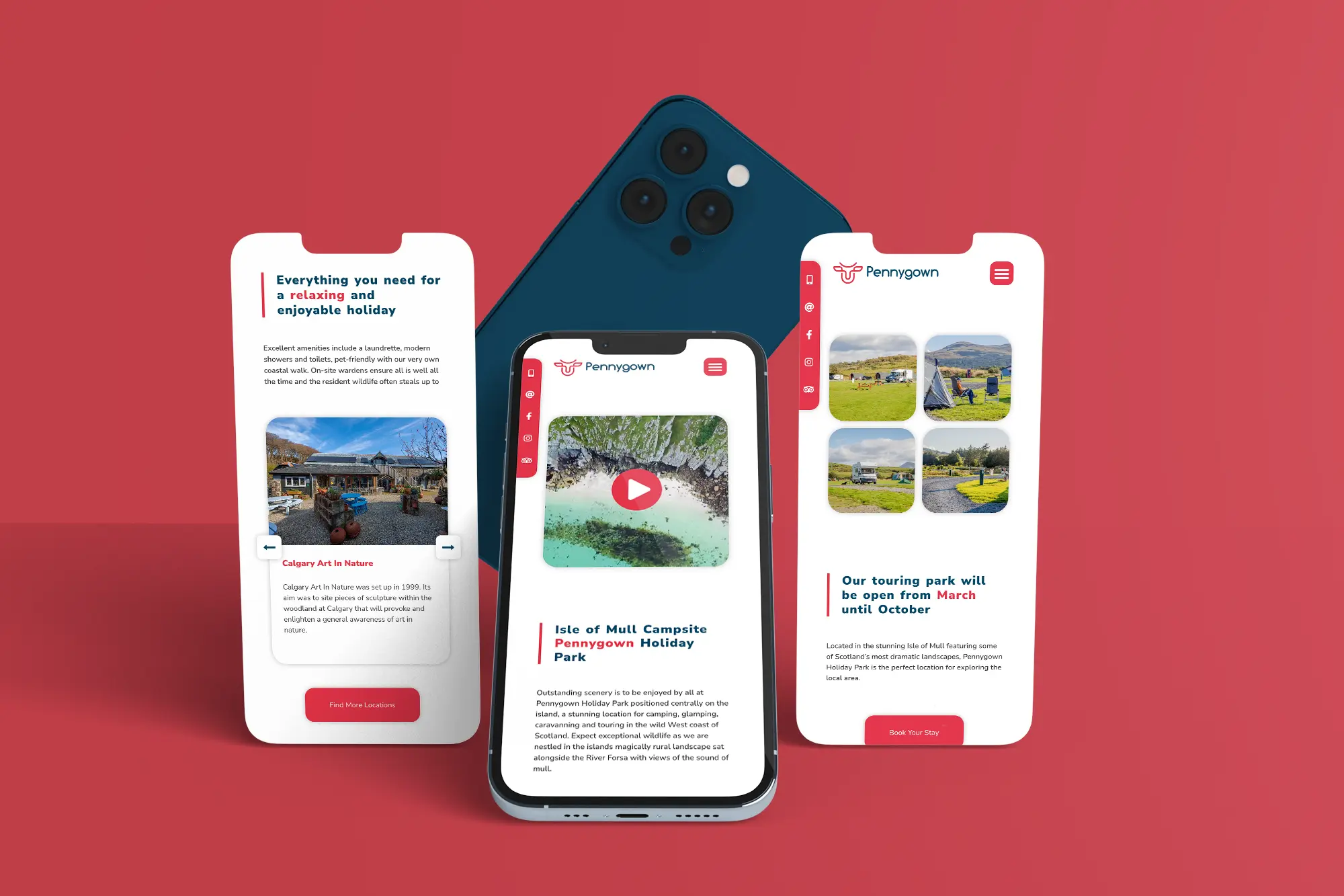 We designed a new website for Pennygown Holiday Park that combines a fun, modern aesthetic with user-friendly functionality. The site includes essential features like contact forms and integrates their existing booking system for a seamless reservation process. To build trust, we also added a TripAdvisor widget showcasing positive customer reviews.